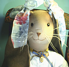 Angelina the Rabbit is part of our Vintage Collection. She is wearing a stunning white vintage dress and a vintage slip. They are both from the 1920s. Her bloomers are newly handmade. Angelina is wearing a vintage locket on a choker around her neck. Angelina loves her mom very much,and is excited because she is all dressed up to go to her mom's surprise birthday party. (All the rabbits have been planning it for weeks!) She carries a present with a card attached to it. The card tells her mom that she loves her very much. She has large ribbons adorning her lovely ears. Angelina is made of 100% wool flannel. She would make the perfect gift for any mom or mom-to-be! $249.00