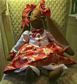Chrissie the Christmas Rabbit is part of our Contemporary Collection. Her red, gold and white dress is in a fabric that is adorned with gold poinsettias. She is wearing festive long gold satin bloomers under her lovely dress. All clothing is newly handmade. Chrissie herself is made from 100% fine wool flannel. Her dress is made of satin and brocade. The dress is adorned with three beautiful vintage buttons. She is all dressed up for the holidays and is wearing her special poinsettia bracelet that is adorned with Swarovski crystals. Chrissie the Chrismas Rabbit measures approximately 25 inches tall. (Please note that Chrissie has changed her ear ribbons to gold. Much more festive!)